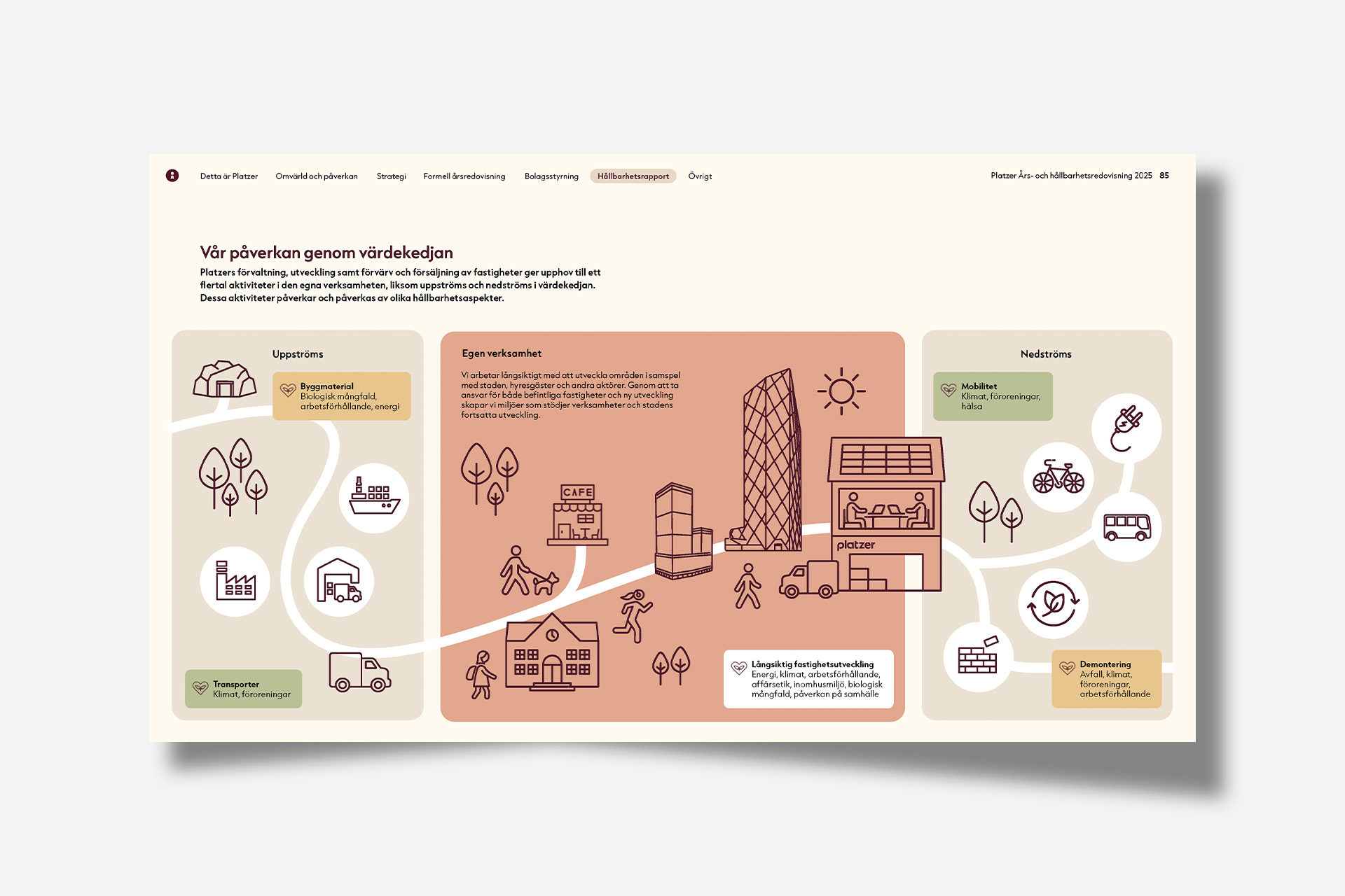 Års- och hållbarhetsredovisningen 2025 är den första produkten där Platzers nya visuella identitet är applicerad. Framvagnen är uppbyggd runt det uppdaterade investment case som Solberg har arbetat fram tillsammans med Platzer. Vi har även samarbetat kring en helt ny värdekedja.