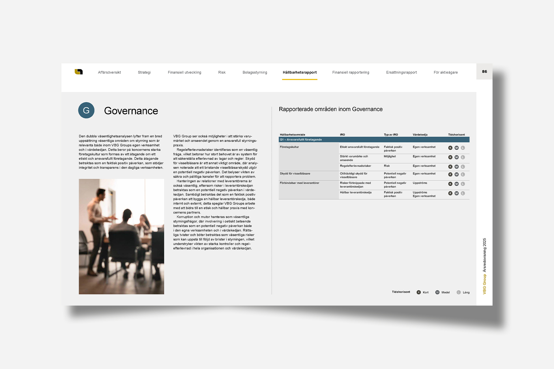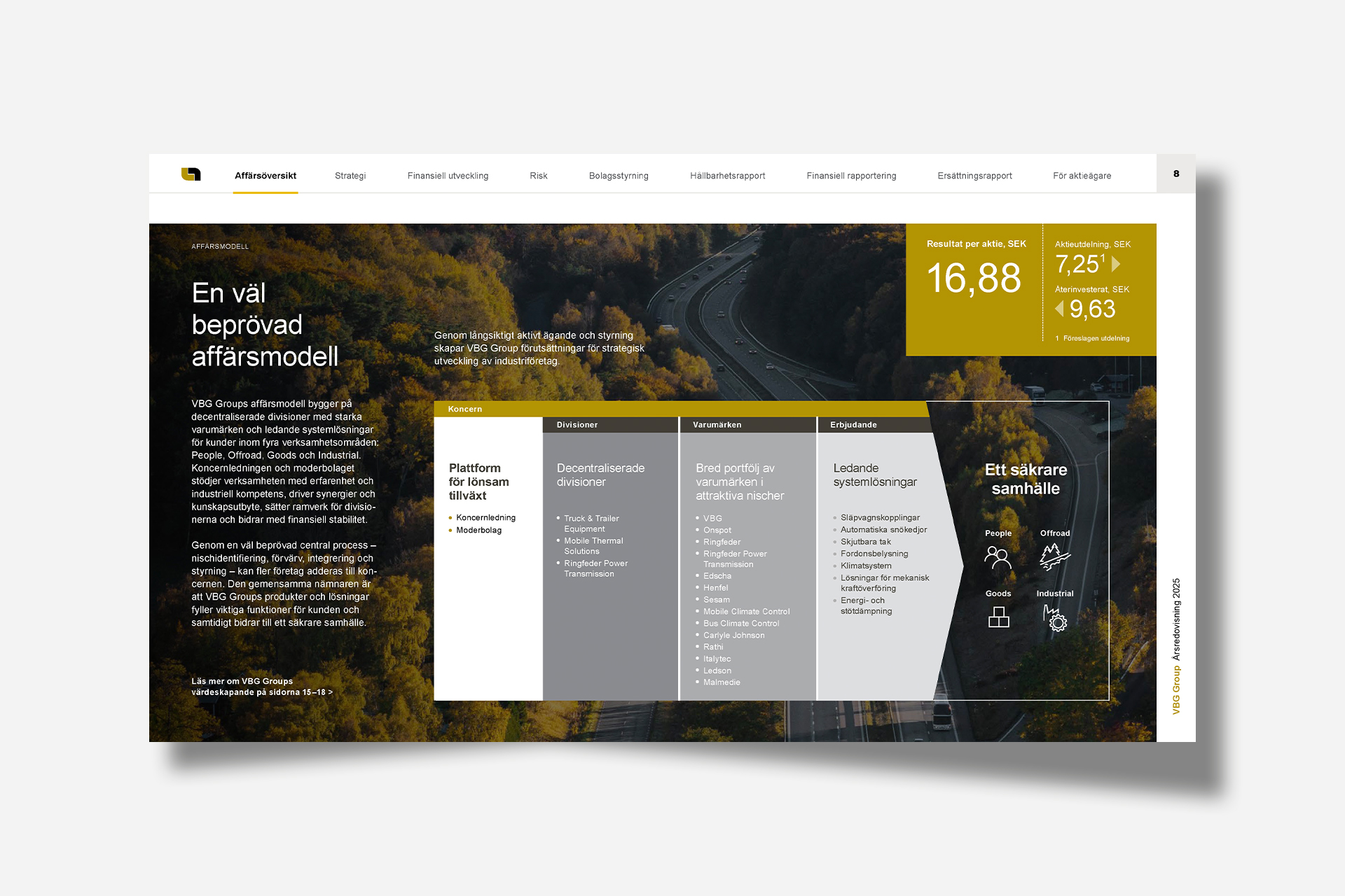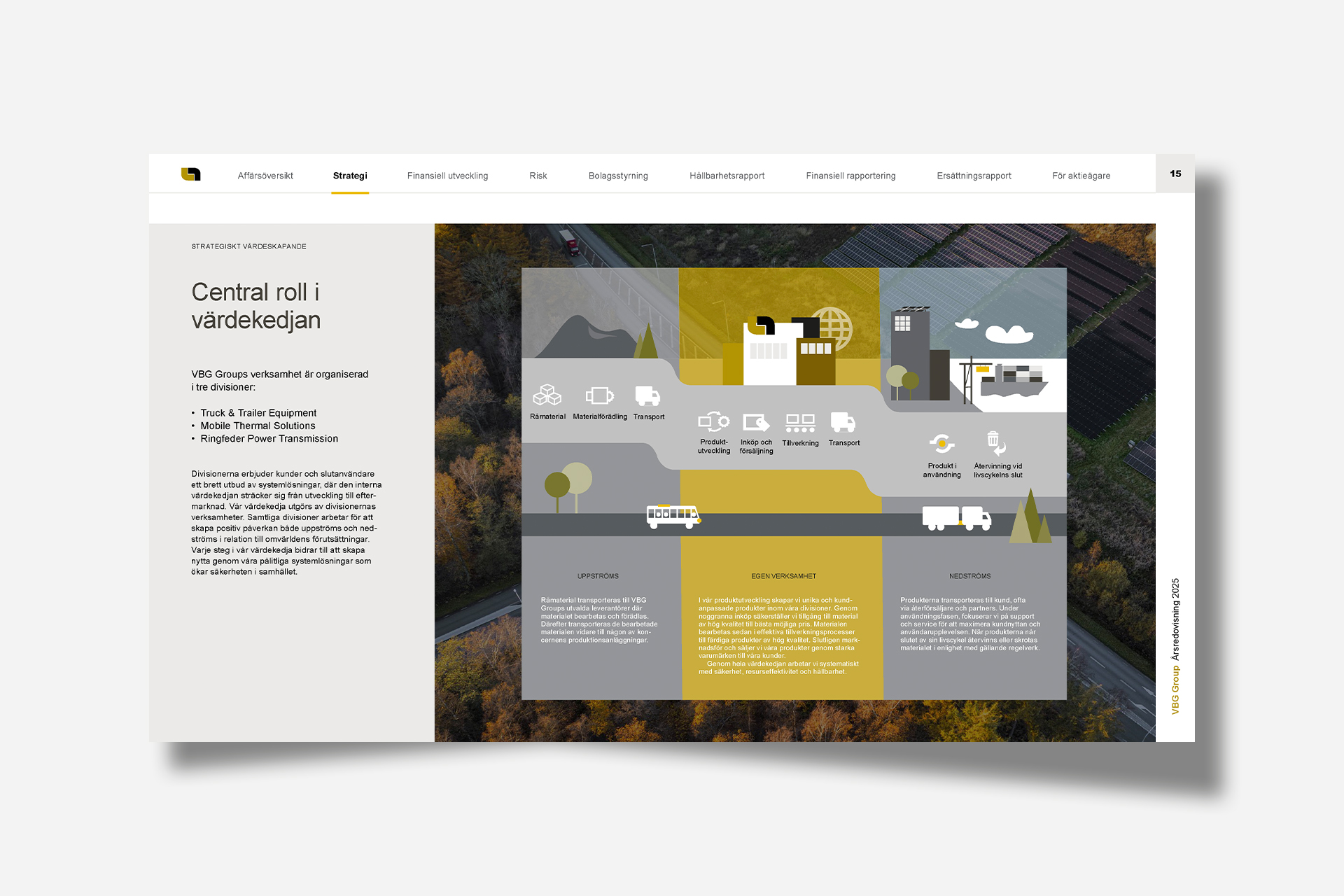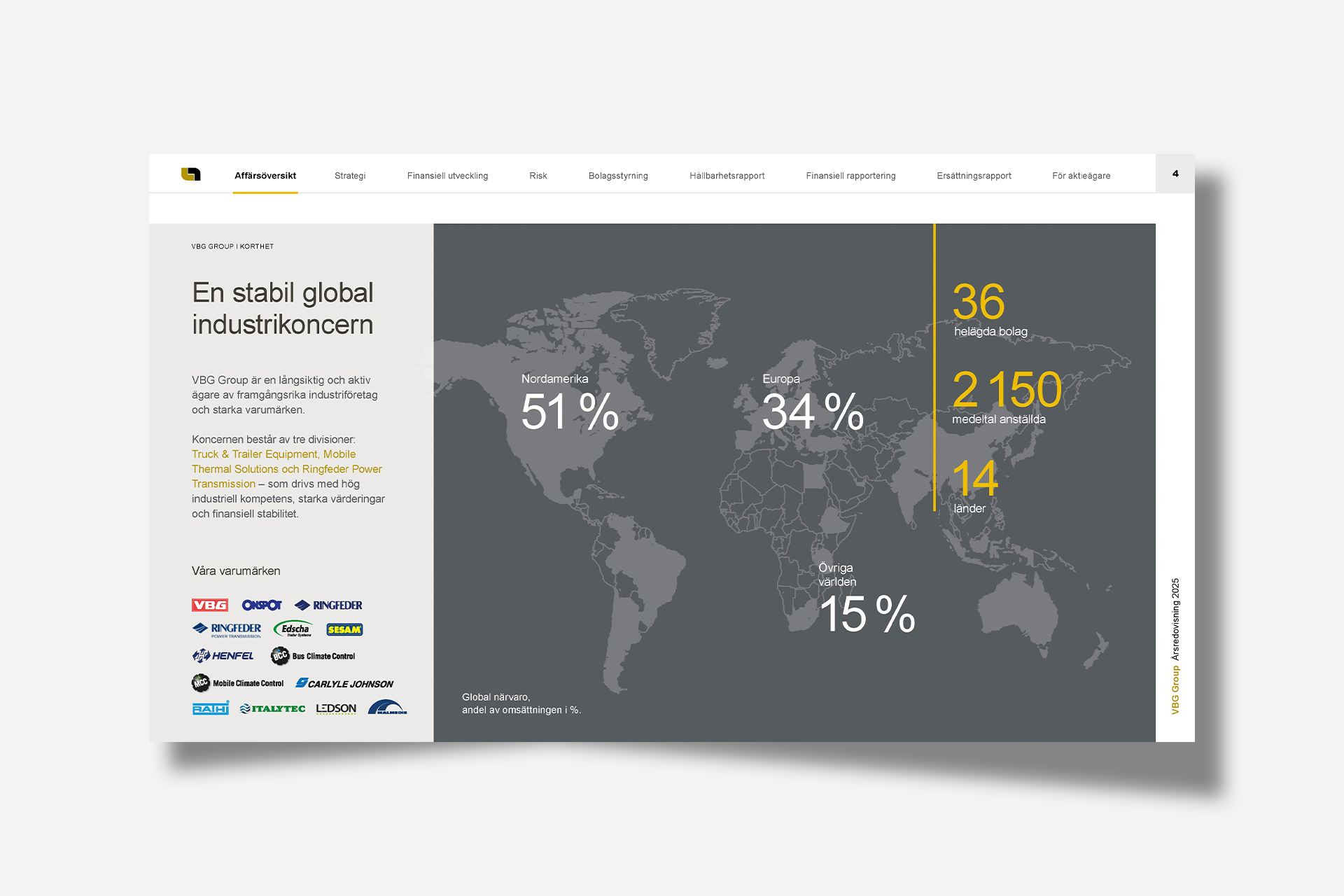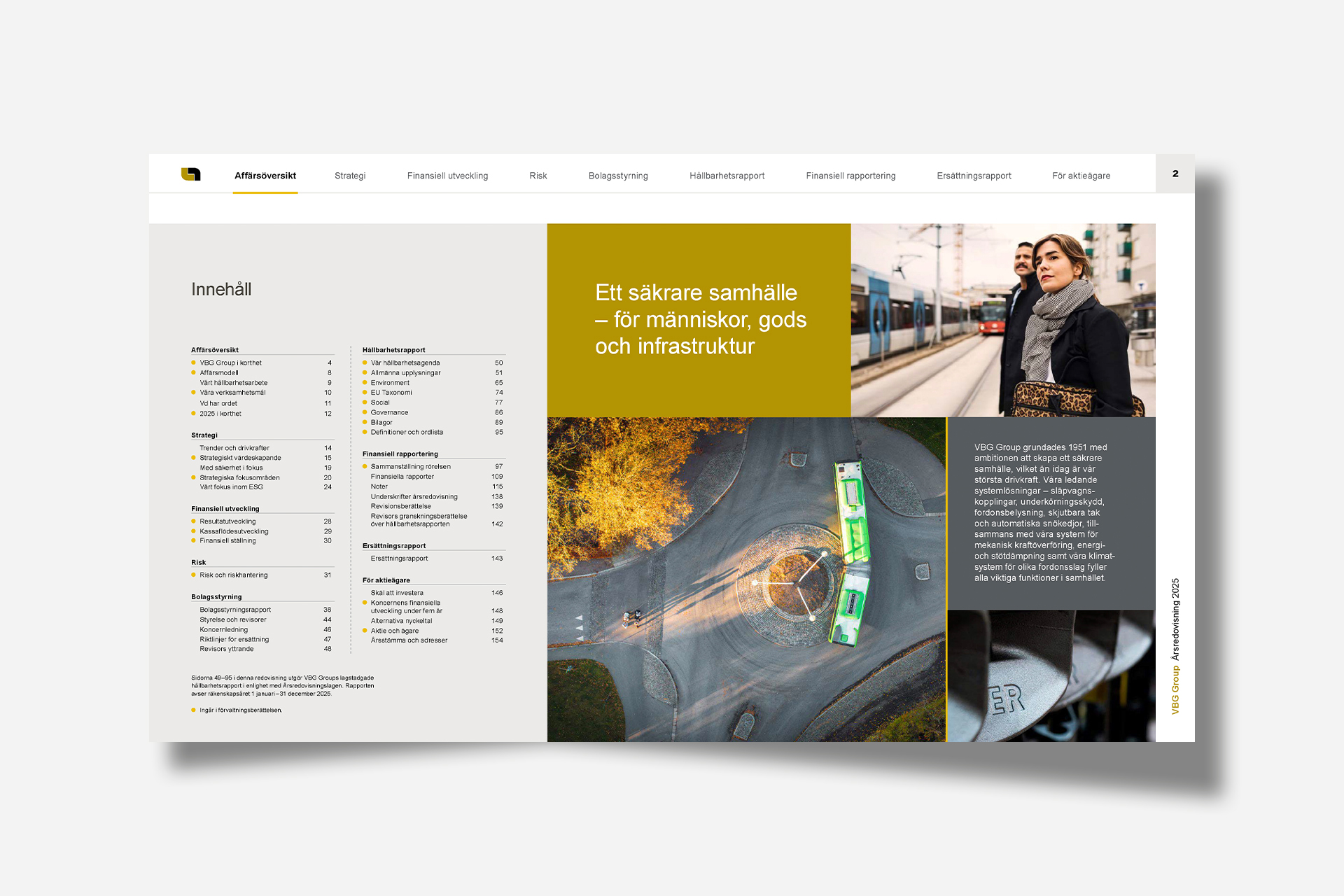 Under 2025 fortsatte samarbetet genom bland annat produktion av VBG Groups delårsrapporter samt utveckling och produktion av VBG Groups årsredovisning. Solbergs stöd i samband med årsredovisningen 2025 innefattade projektledning, IR- och hållbarhetsrådgivning, copy, design, produktion och tryckhantering.