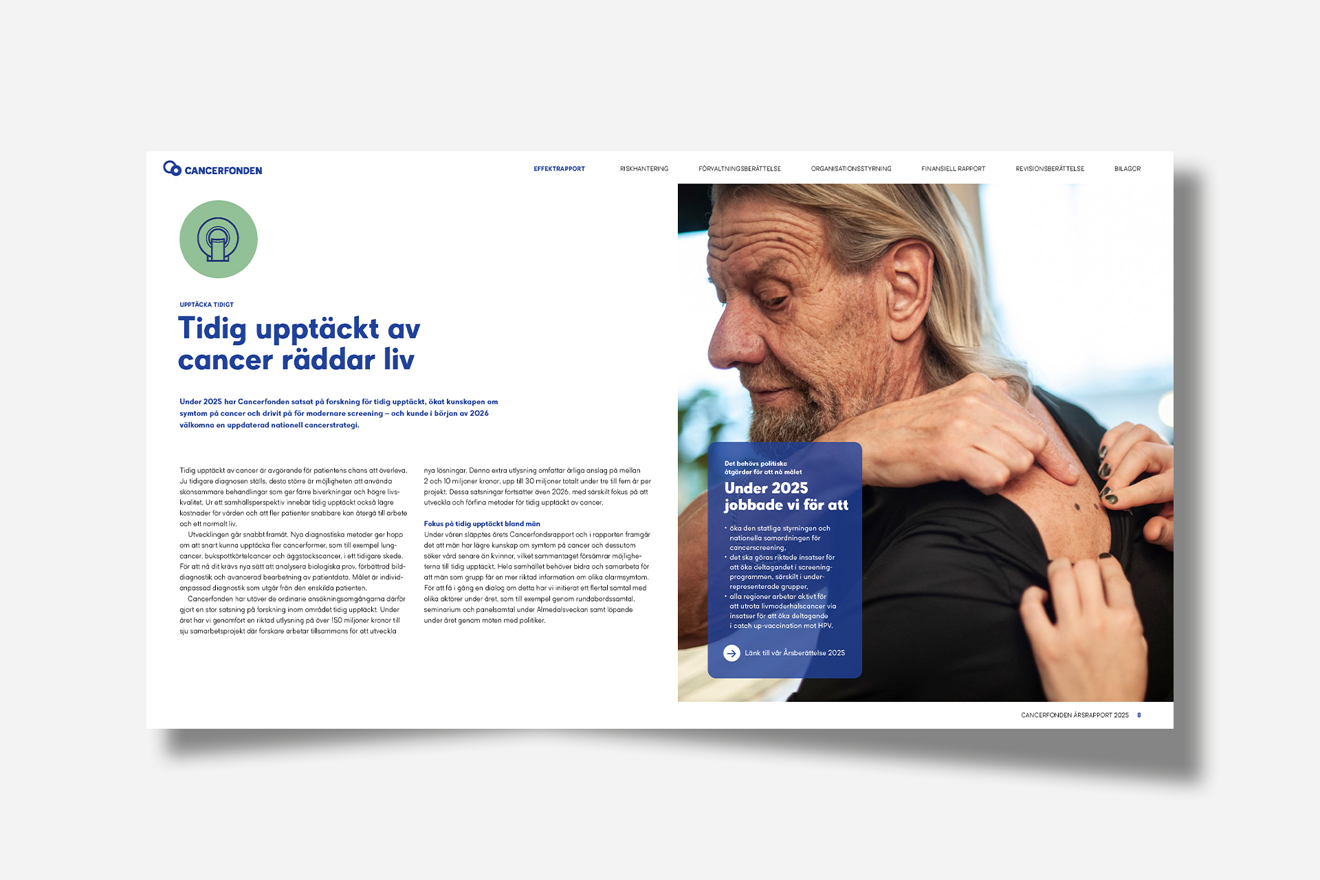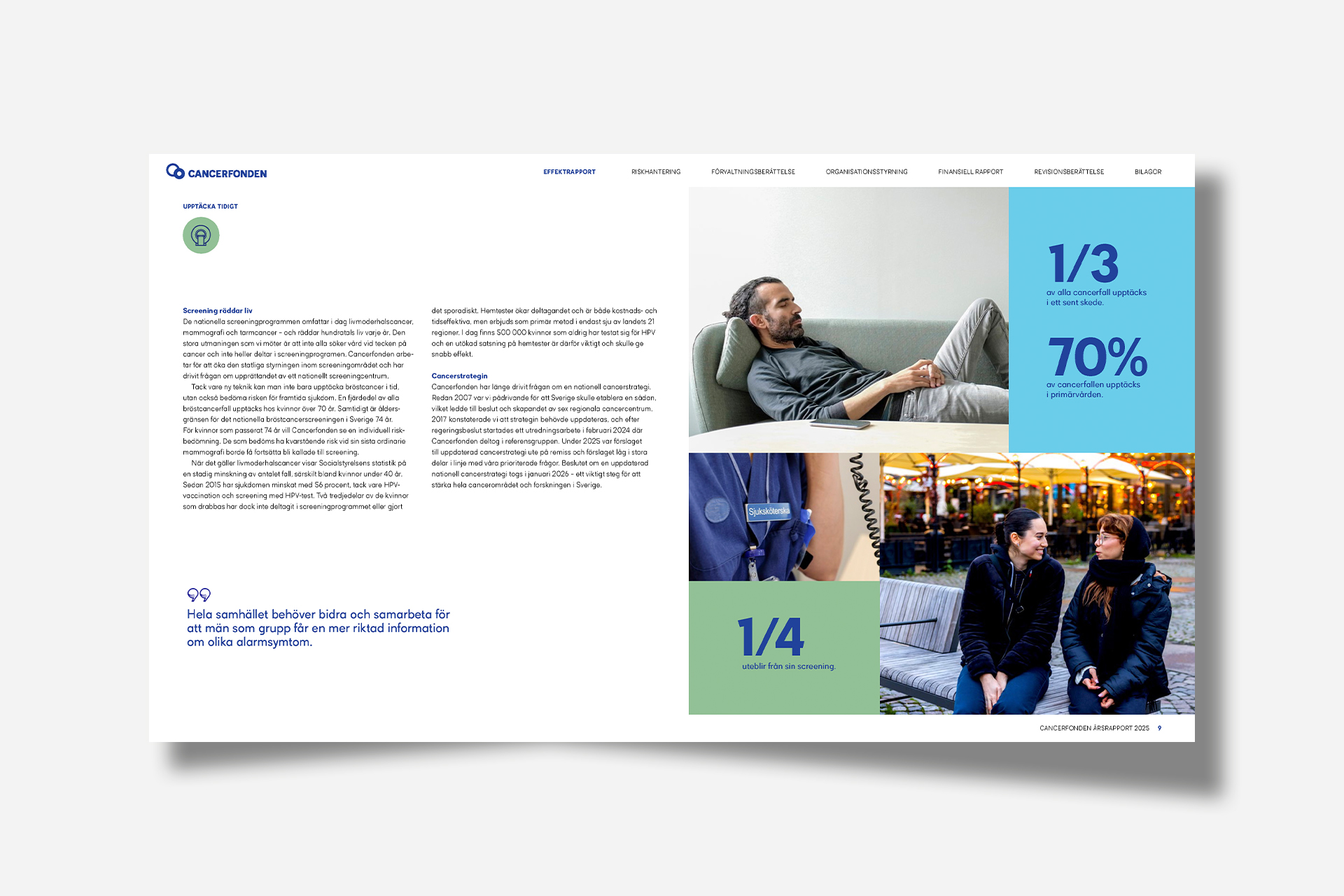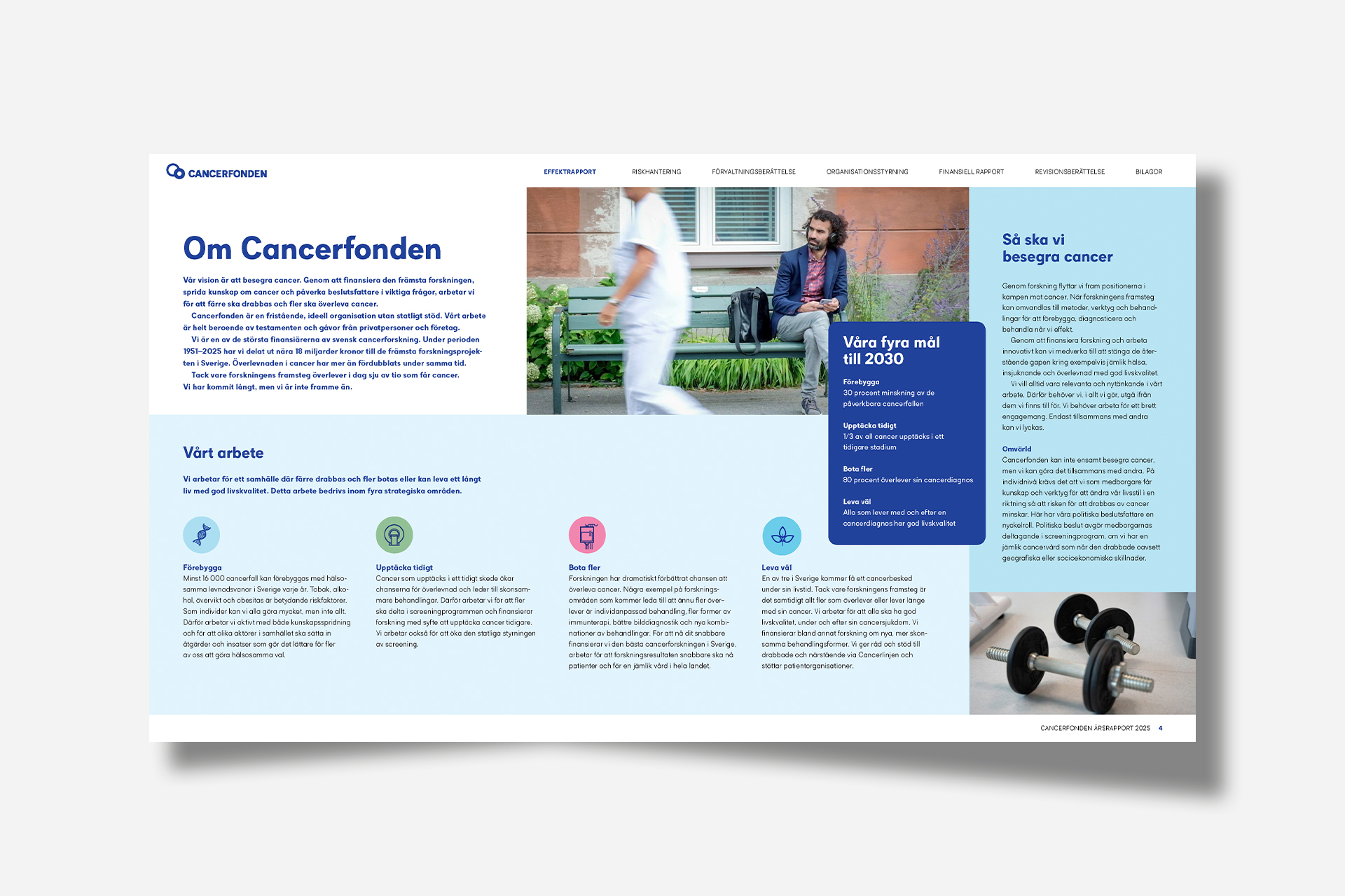 Resultatet blev en genomtänkt rapport med en sammanhållande strategisk röd tråd. Årsrapporten kompletterar online‑rapporten och bidrar till att stärka Cancerfondens trovärdighet – vilket är viktigt i tider med ökad desinformation.