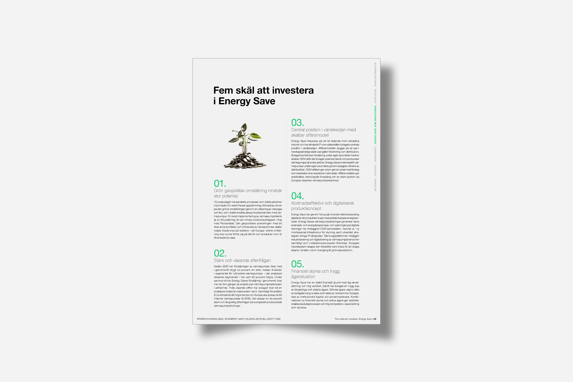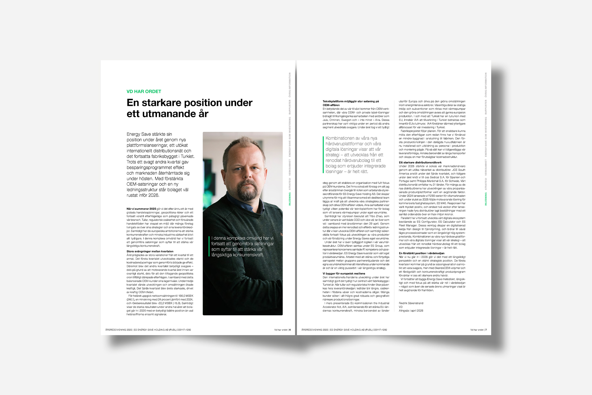 I samband med årsredovisningen för 2025 bidrog Solberg med rådgivning och skribentstöd som bland annat mynnade ut i case för affärsområdena, marknadsutblick och ett nytt investment case – samt översyn av beskrivningen Energy Saves strategi och affärsmodell.
