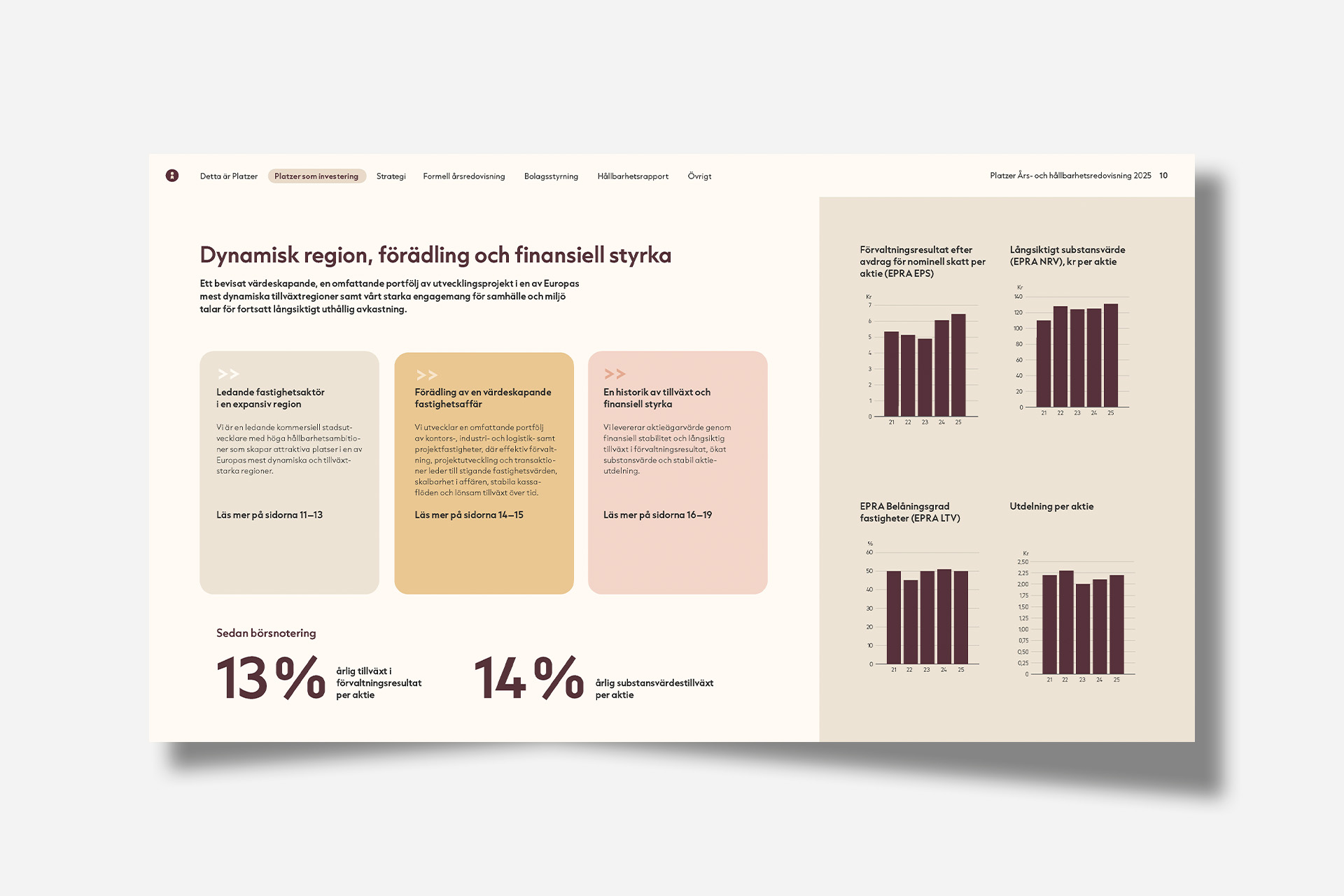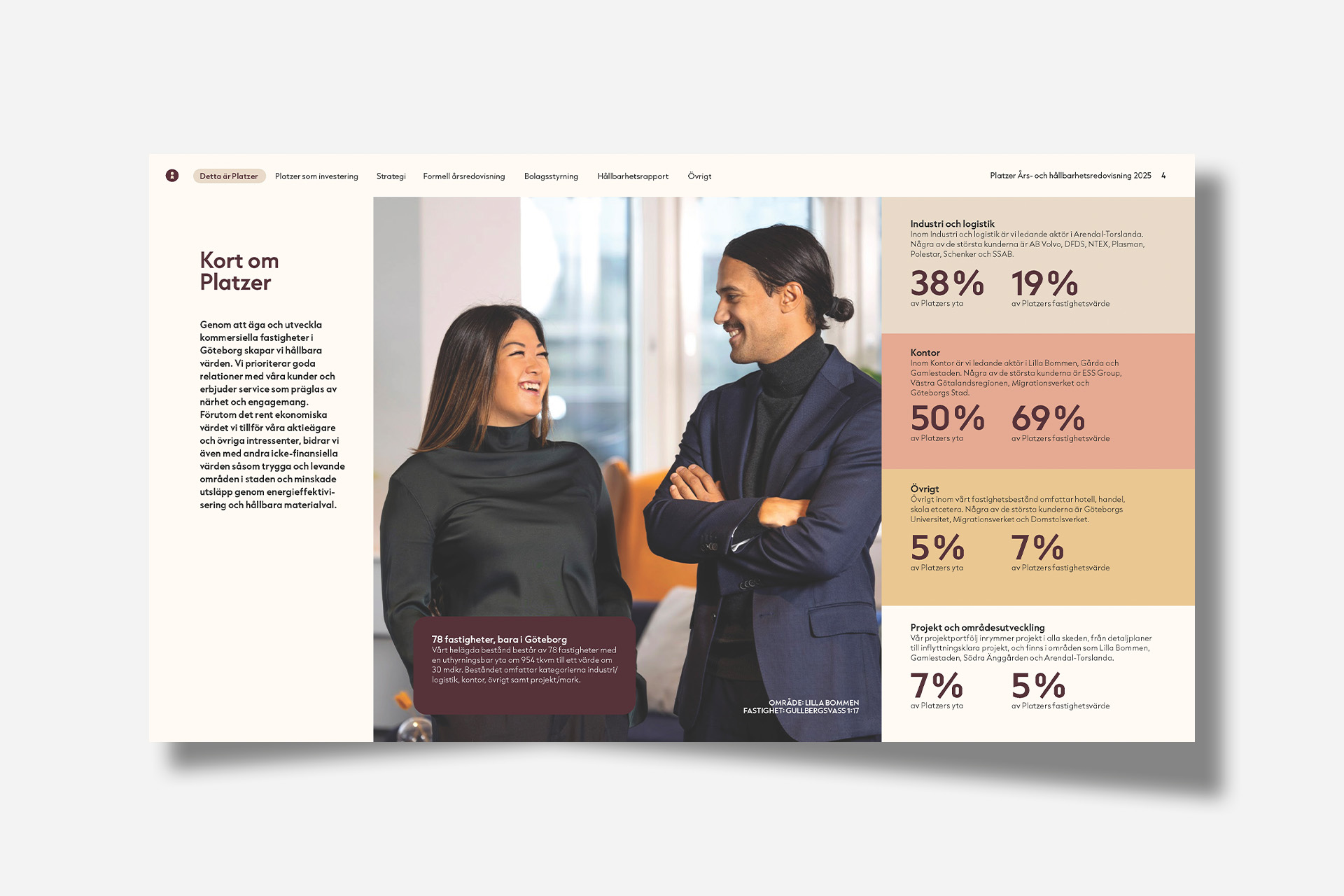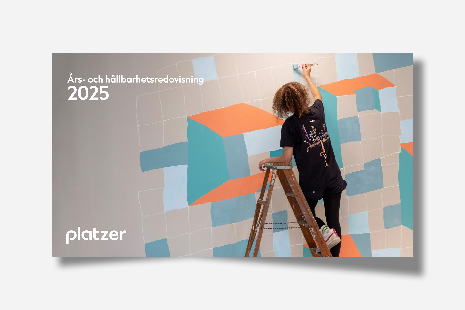 Års- och hållbarhetsredovisningen 2025 är den första produkten där Platzers nya visuella identitet är applicerad. Framvagnen är uppbyggd runt det uppdaterade investment case som Solberg har arbetat fram tillsammans med Platzer. Vi har även samarbetat kring en helt ny värdekedja.