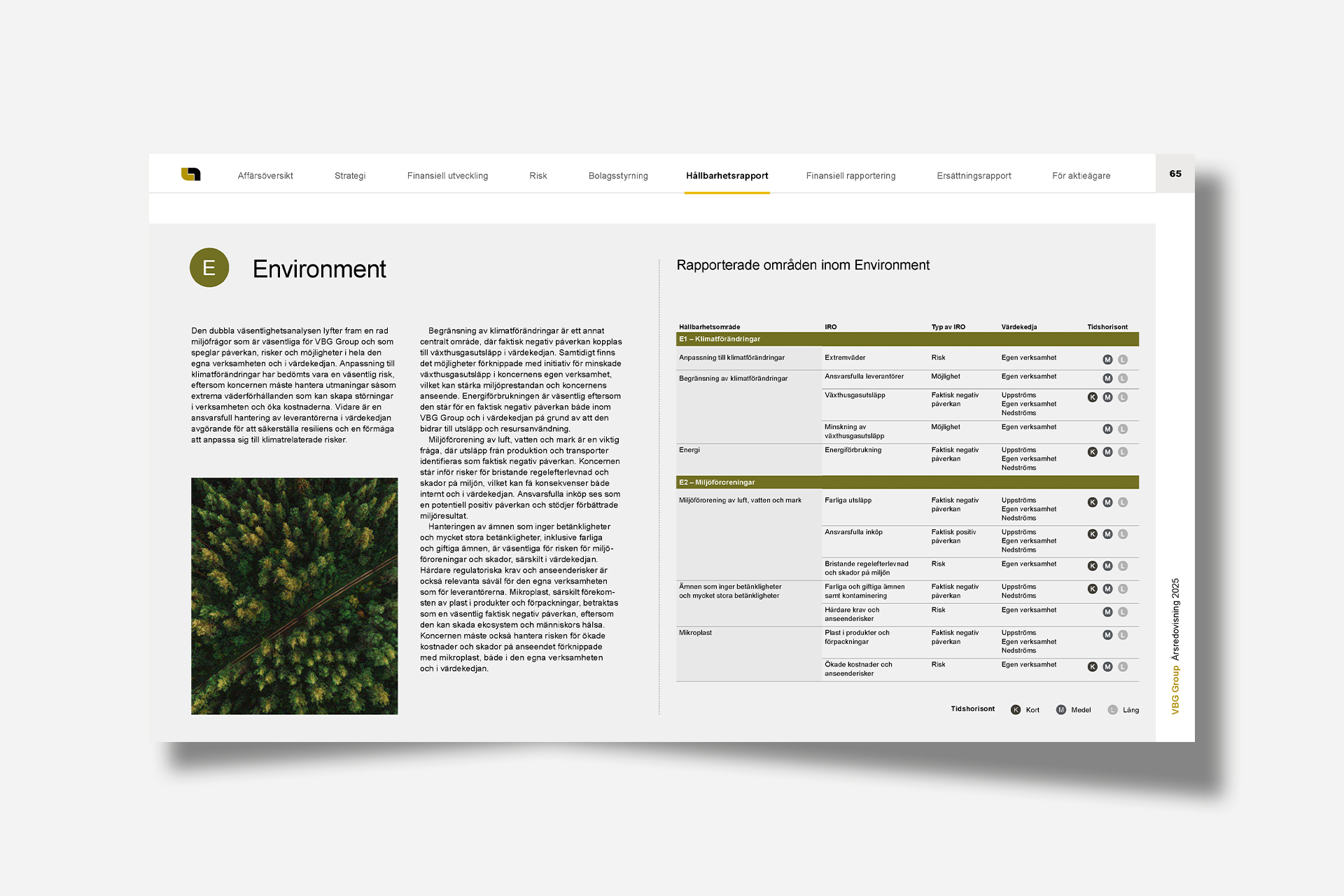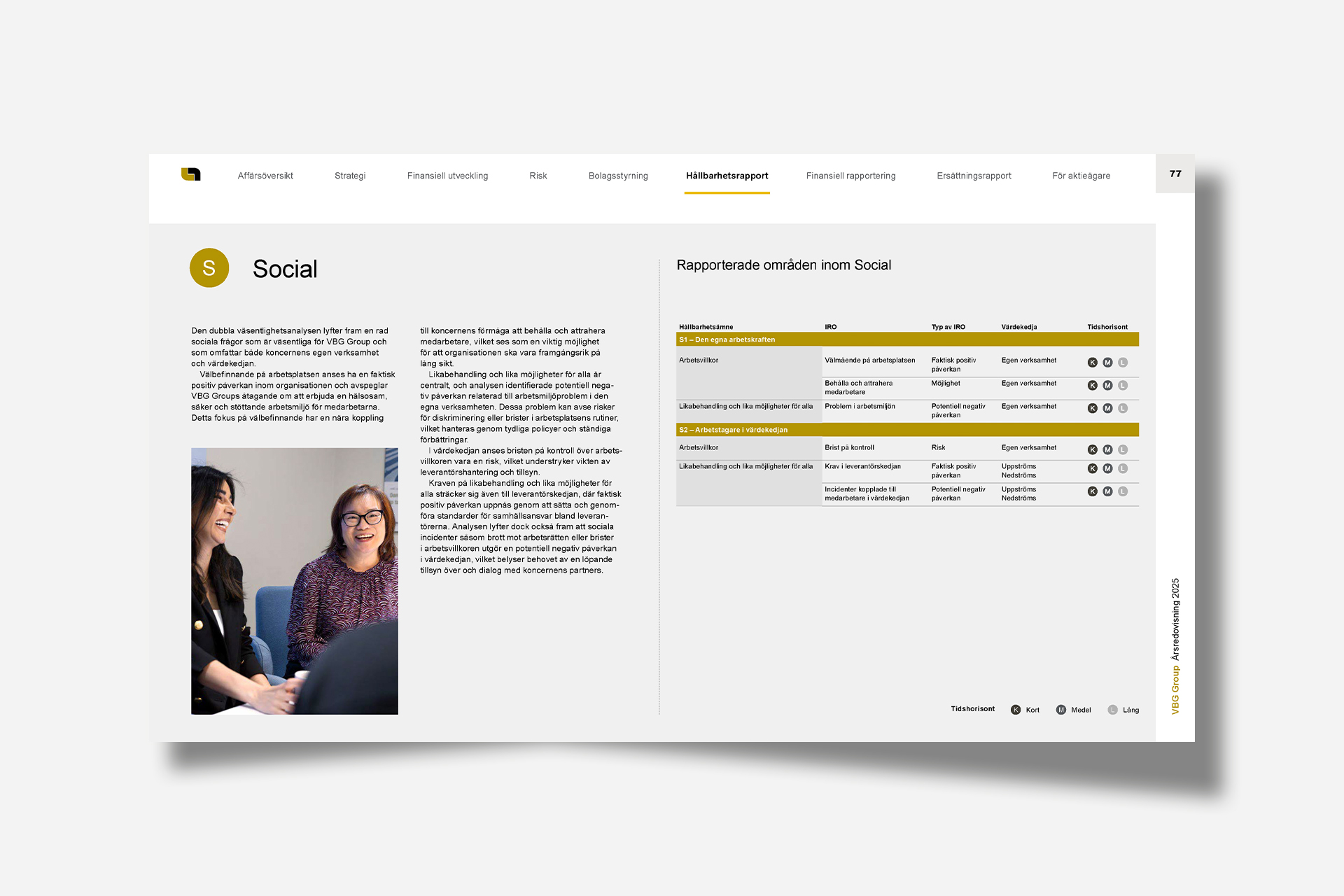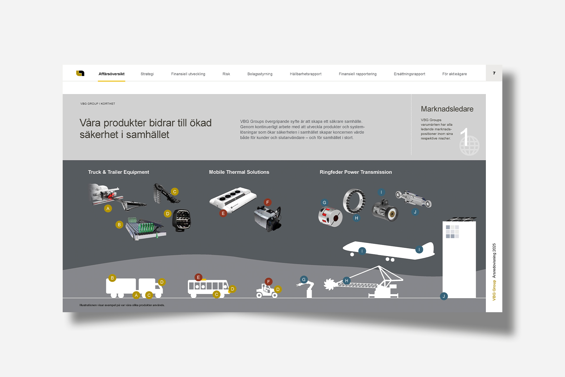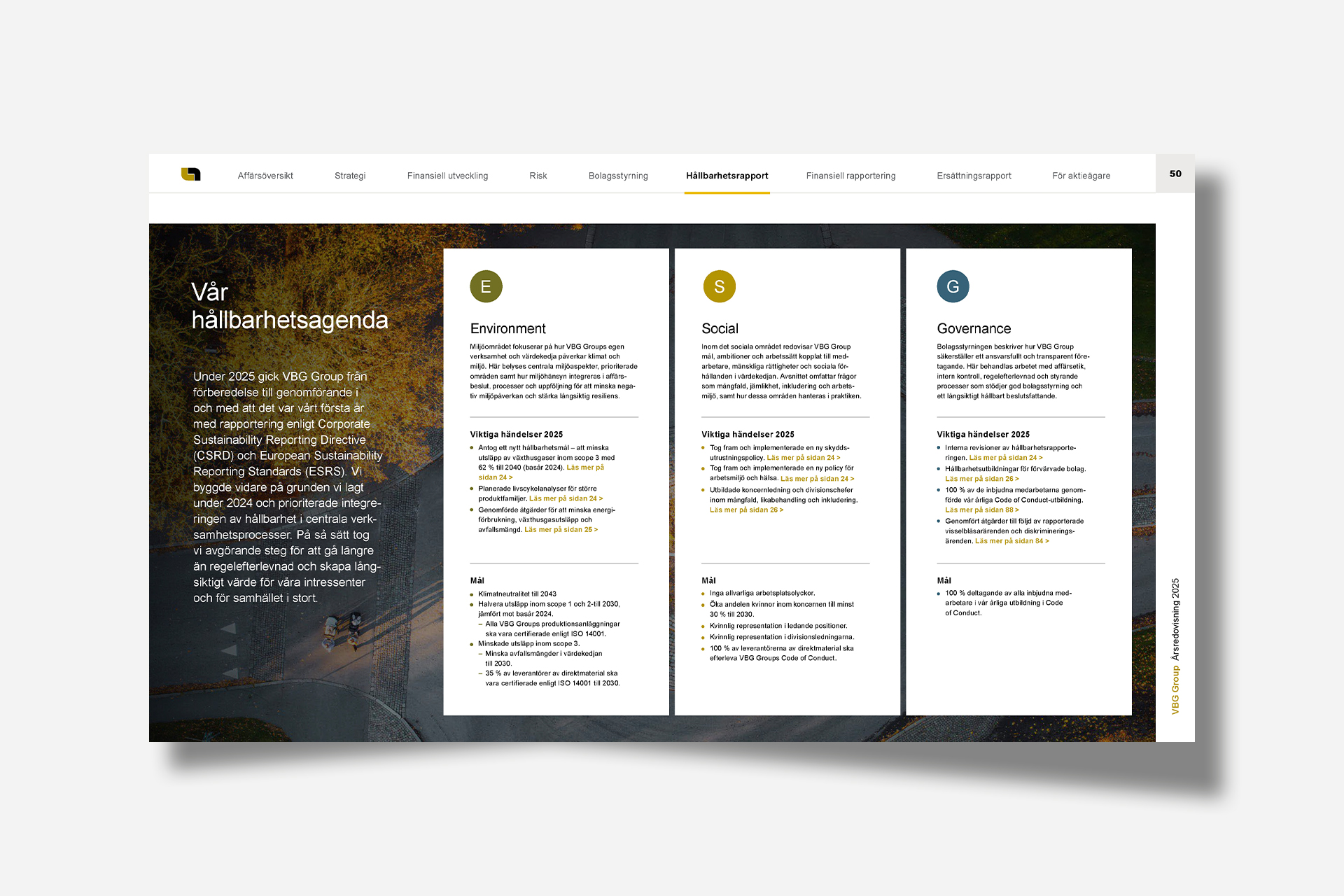 Under 2025 fortsatte samarbetet genom bland annat produktion av VBG Groups delårsrapporter samt utveckling och produktion av VBG Groups årsredovisning. Solbergs stöd i samband med årsredovisningen 2025 innefattade projektledning, IR- och hållbarhetsrådgivning, copy, design, produktion och tryckhantering.