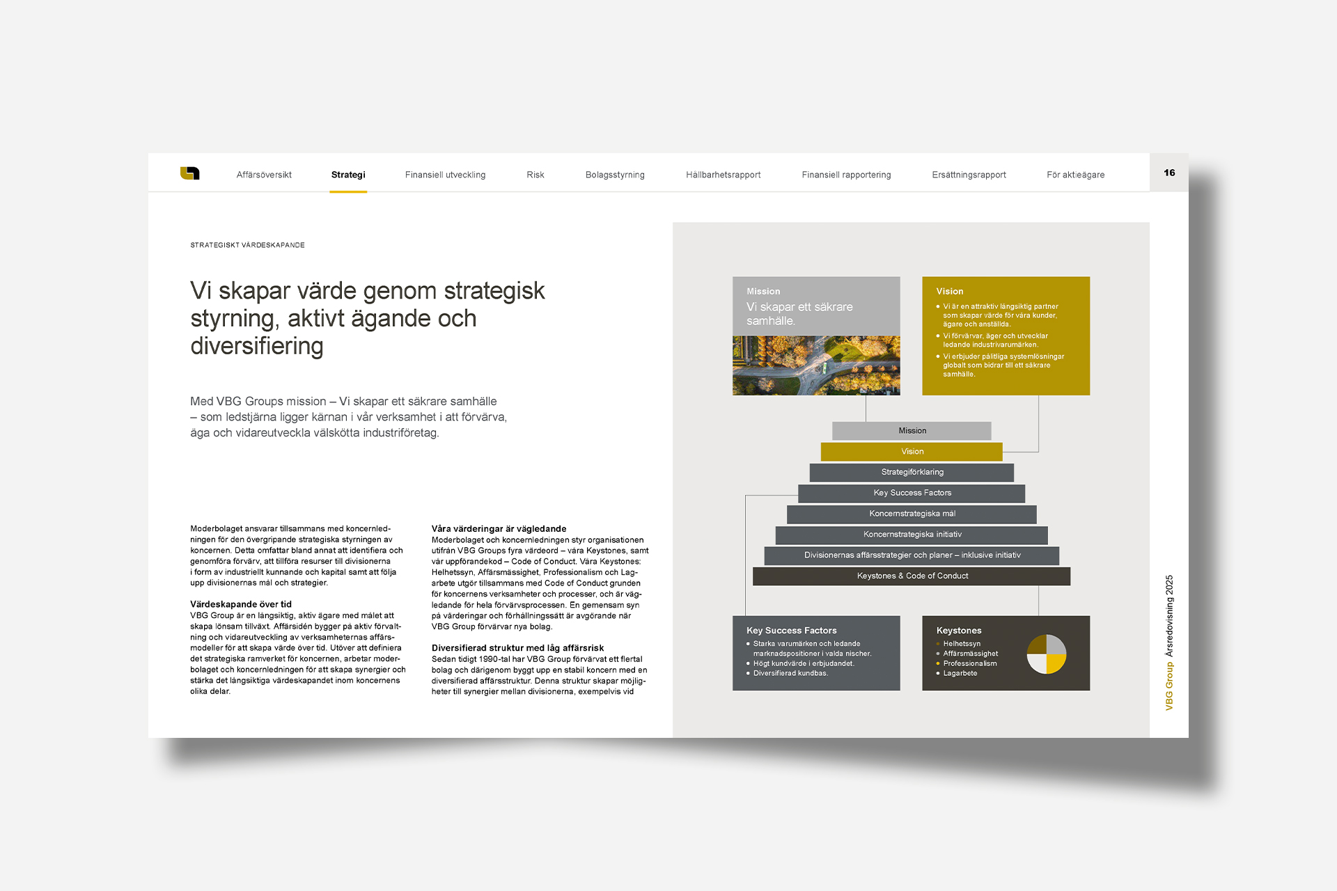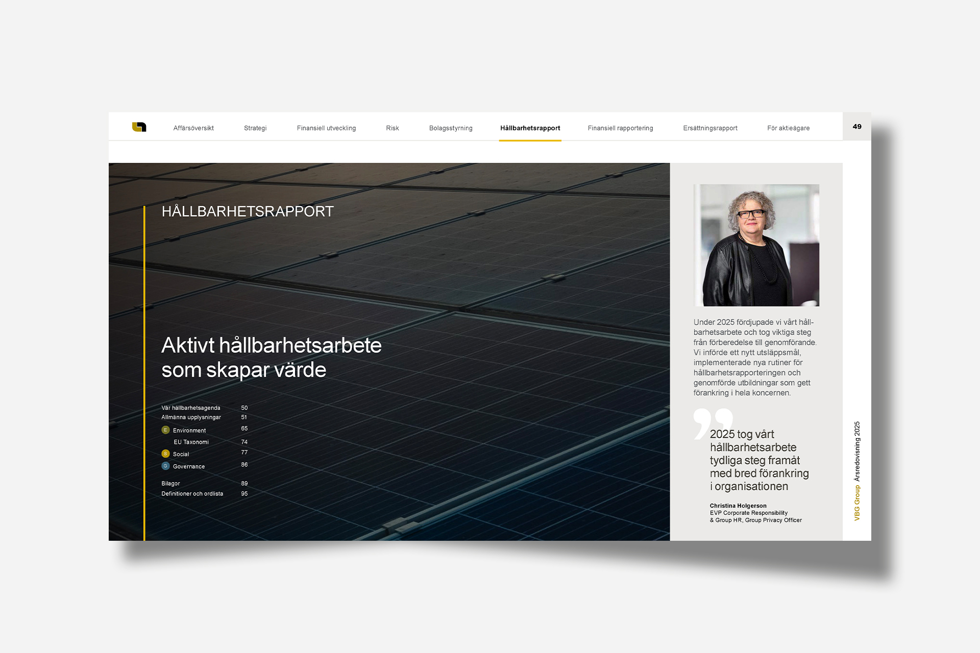 Fokus för årets redovisning låg, utöver årlig avrapportering och produktion av en visuellt tilltalande produkt, på att vidareutveckla bolagets hållbarhetsrapport för att den skulle leva upp till de europeiska standarderna för hållbarhetsrapportering (ESRS). Därutöver fanns en önskan att integrera rapportens förvaltningsberättelse och säkerställa ett tydligt informationsflöde med klara budskap grundade i bolagets mission: Vi skapar ett säkrare samhälle.